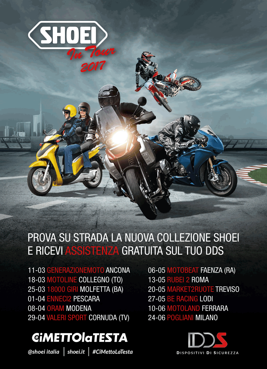 Anche quest’anno faremo visita ad alcuni dei nostri concessionari ufficiali in tutta Italia, per far provare su strada tutta la gamma Shoei 2017 e offrire assistenza tecnica gratuita a tutti coloro che possiedono già un Dispositivo di Sicurezza Shoei.